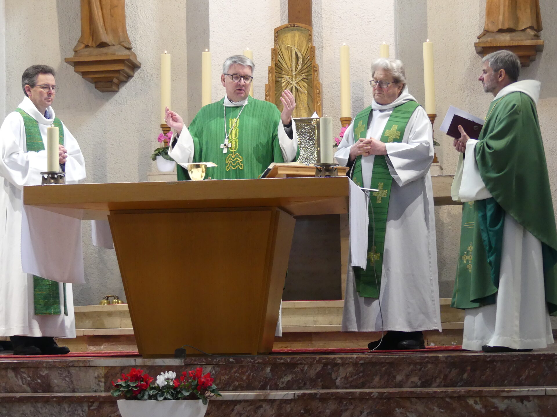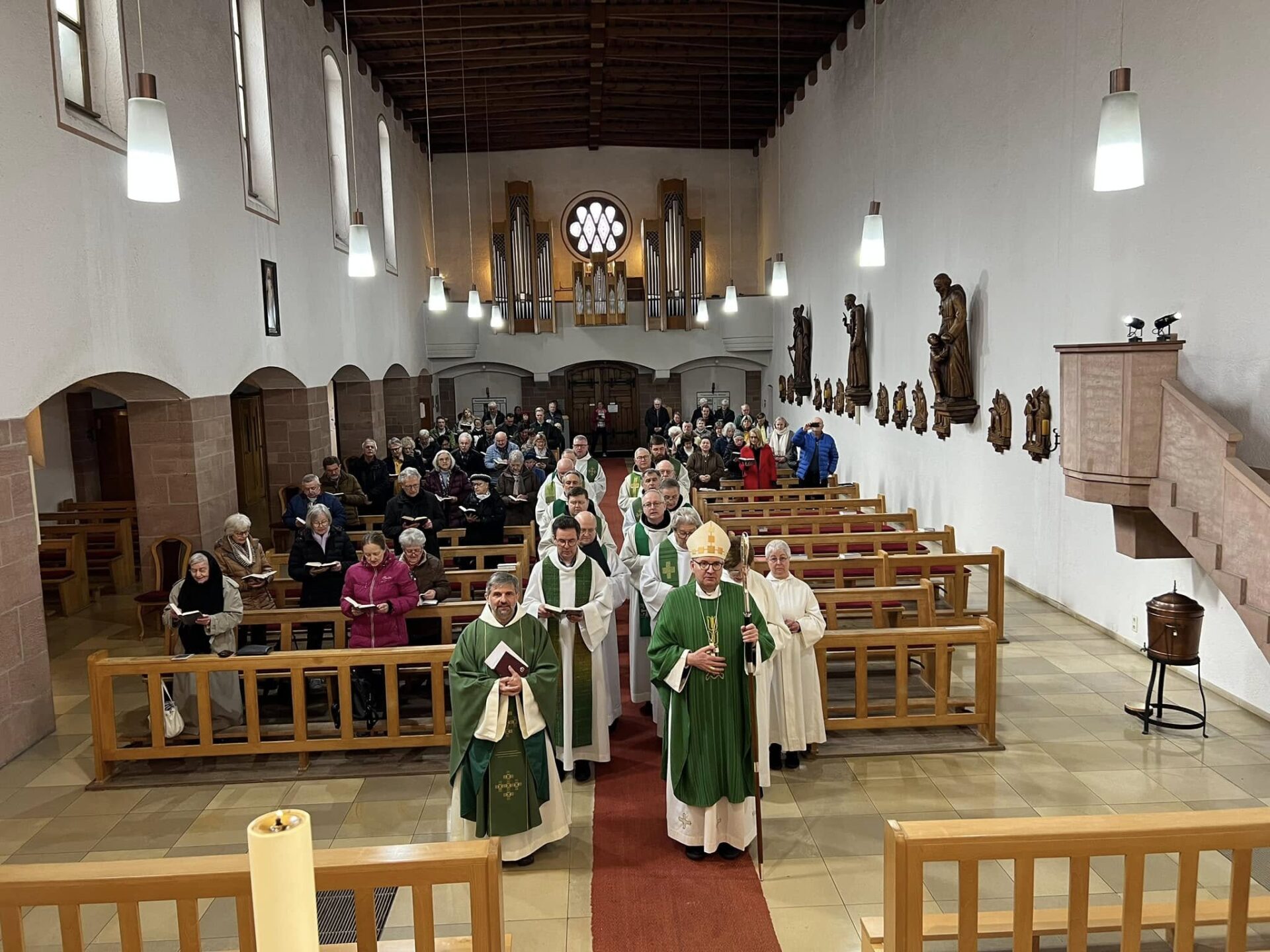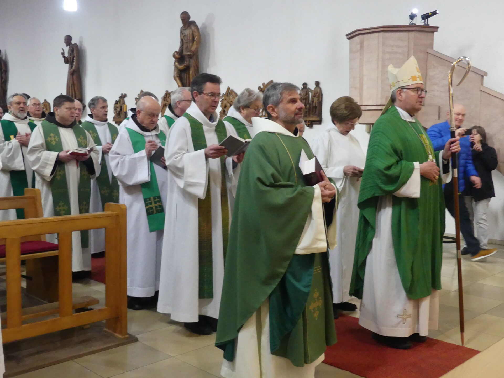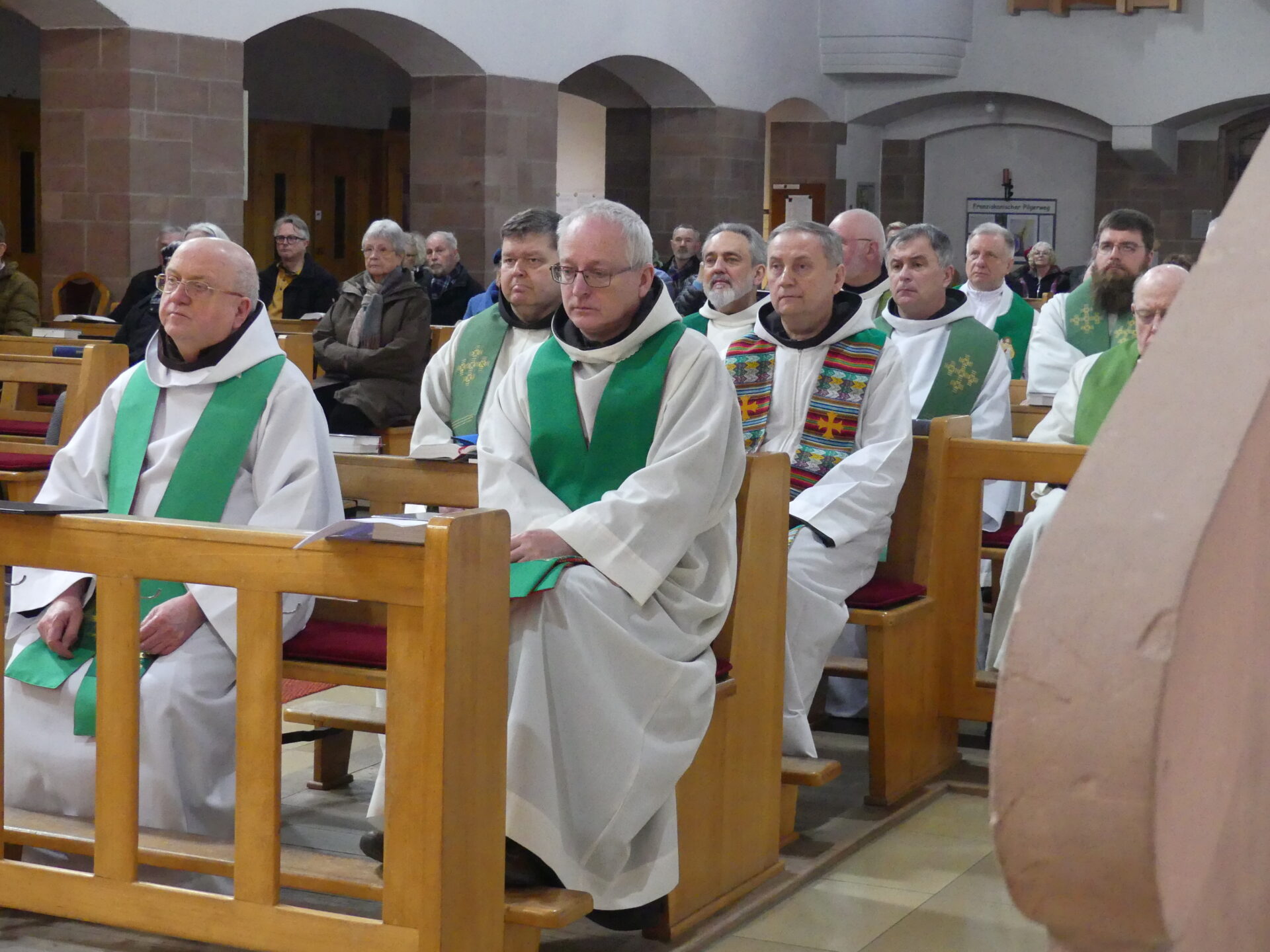 Na pamiątkę 40 rocznicy franciszkańskiej pracy w bensheimskiej winnicy Pańskiej dziękowaliśmy Miłosiernemu Bogu za to, że nam błogosławi, Biskupowi i duchowieństwu z diecezji mogunckiej, siostrom i braciom z Bensheim i okolicy, siostrom i braciom z Franciszkańskiego Zakonu Świeckich, którzy stale nas wspierają w budowaniu pokoju i dobra. Uczyniliśmy to uroczyście 28 lutego 2025 roku, tj. w piątek, o godzinie 10.30, podczas Eucharystii w kościele klasztornym, której przewodniczył i w trakcie niej wygłosił słowo pasterskie ks. prof. Piotr Kohlgraf, biskup Moguncji. Oparł on swe kazanie na słowach „Wysławiam Cię, Ojcze, Panie nieba i ziemi” z Ewangelii według św. Mateusza (11,25-30). Odwoływał się w nim ponadto do tekstów św. Franciszka z Asyżu, jego życiorysu, do wypowiedzi papieża Franciszka, w tym do encykliki „Laudato si”. Mocno zaakcentował Franciszkowe podejście do bezkonfliktowego tworzenia pokoju, które ma swój wzór w życiu i nauczaniu Pana naszego Jezusa Chrystusa, w kontekście aktualnych konfliktów narodowych i osobistych, uznających tylko siłowe rozwiązania. Propozycje św. Franciszka, chociaż wydają się jakby naiwne i nieskuteczne, okazują się jedynymi właściwymi rozwiązaniami.