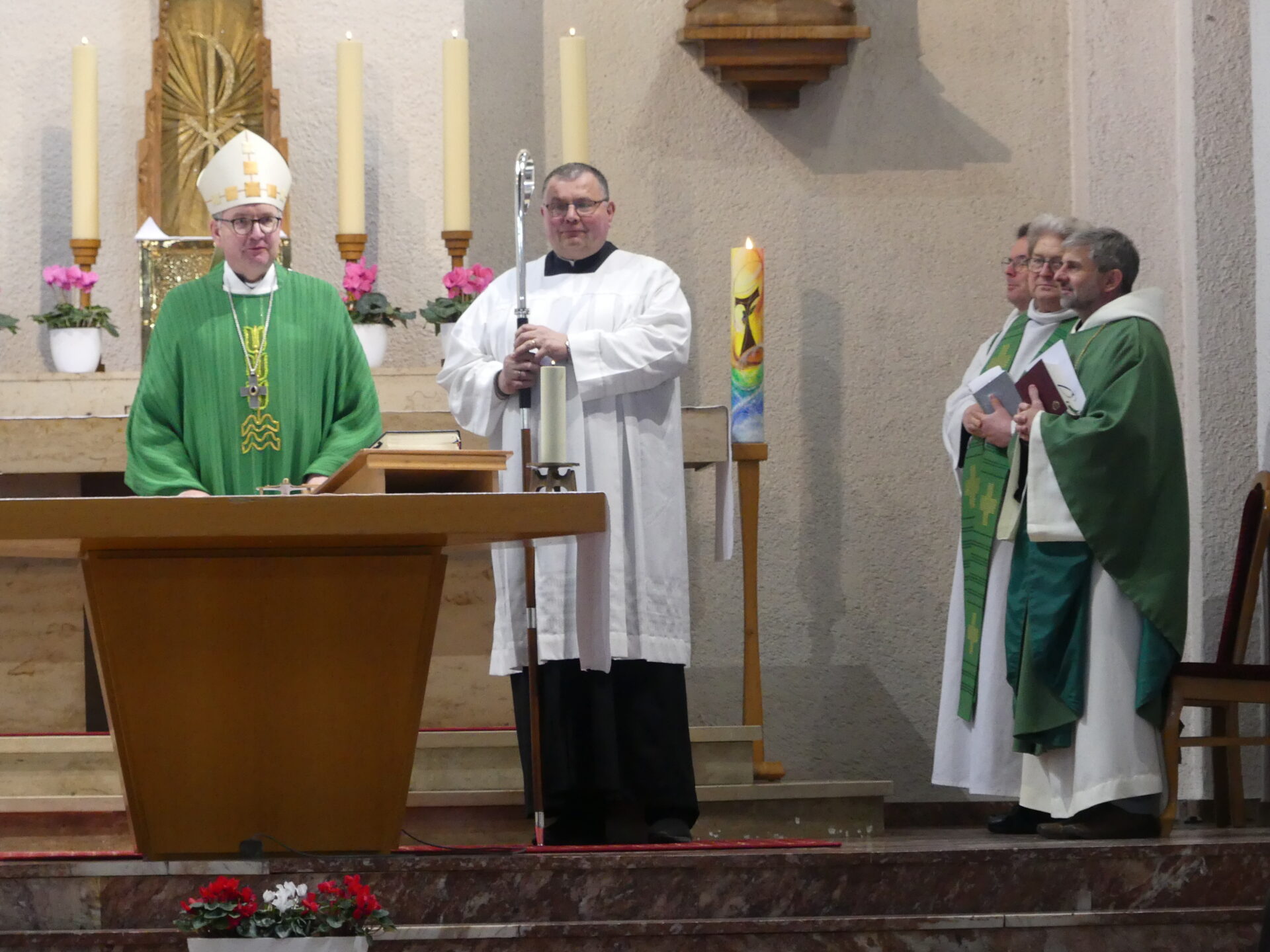 Służbę ołtarza pełniły w prezbiterium trzy dorosłe osoby świeckie. Biskupowi towarzyszył diakon, ceremoniarz i kierowca w jednej osobie.