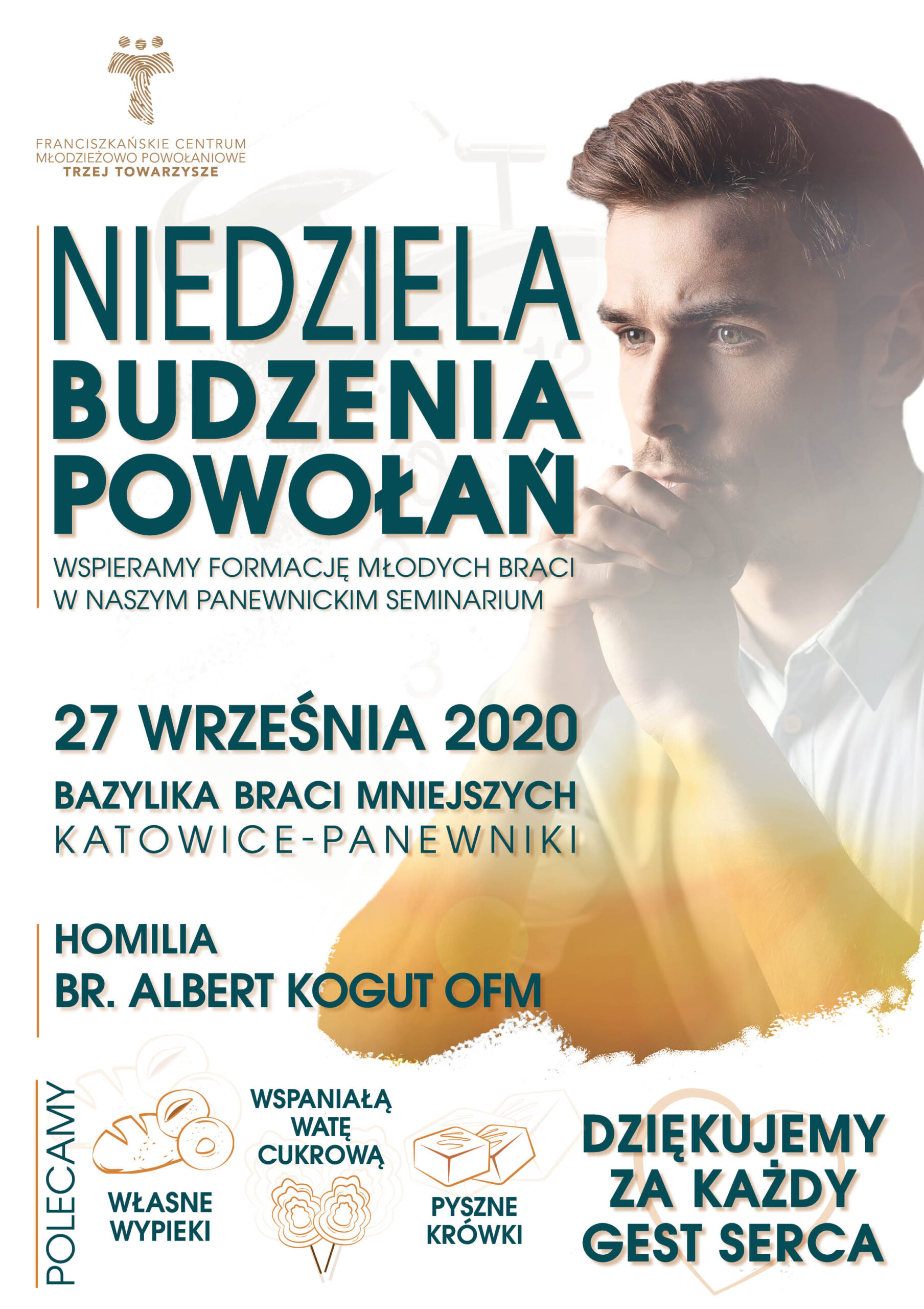 W niedzielę, 27 września, będziemy przeżywać w naszej wspólnocie Niedzielę Budzenia Powołań. Chcemy w tym dniu szczególnie dziękować Panu Bogu za dar powołań oraz modlić się o nowe powołania franciszkańskie do naszej prowincji zakonnej. W tym dniu zbierzemy przed kościołem ofiary na utrzymanie i kształcenie naszych braci w formacji. Będzie również możliwość zaopatrzenia się w ciasto upieczone własnoręcznie przez braci.