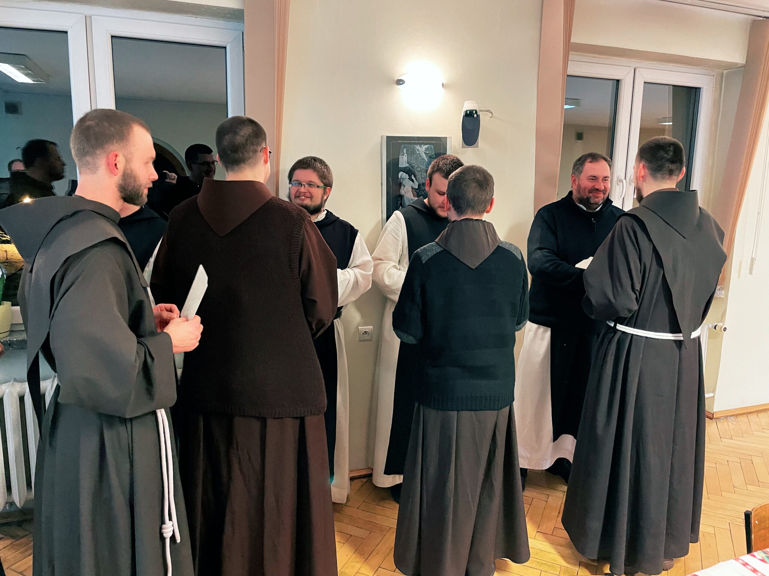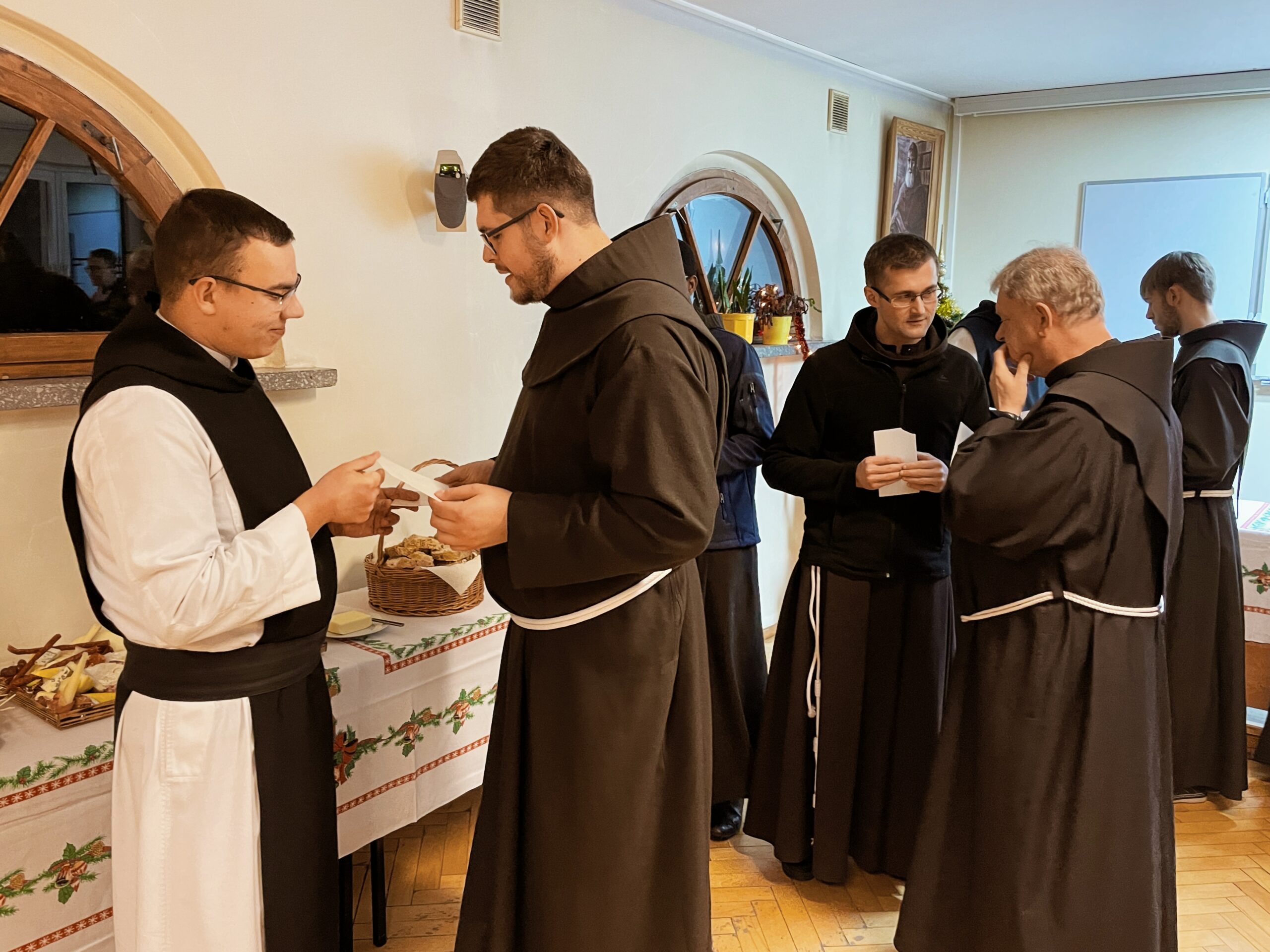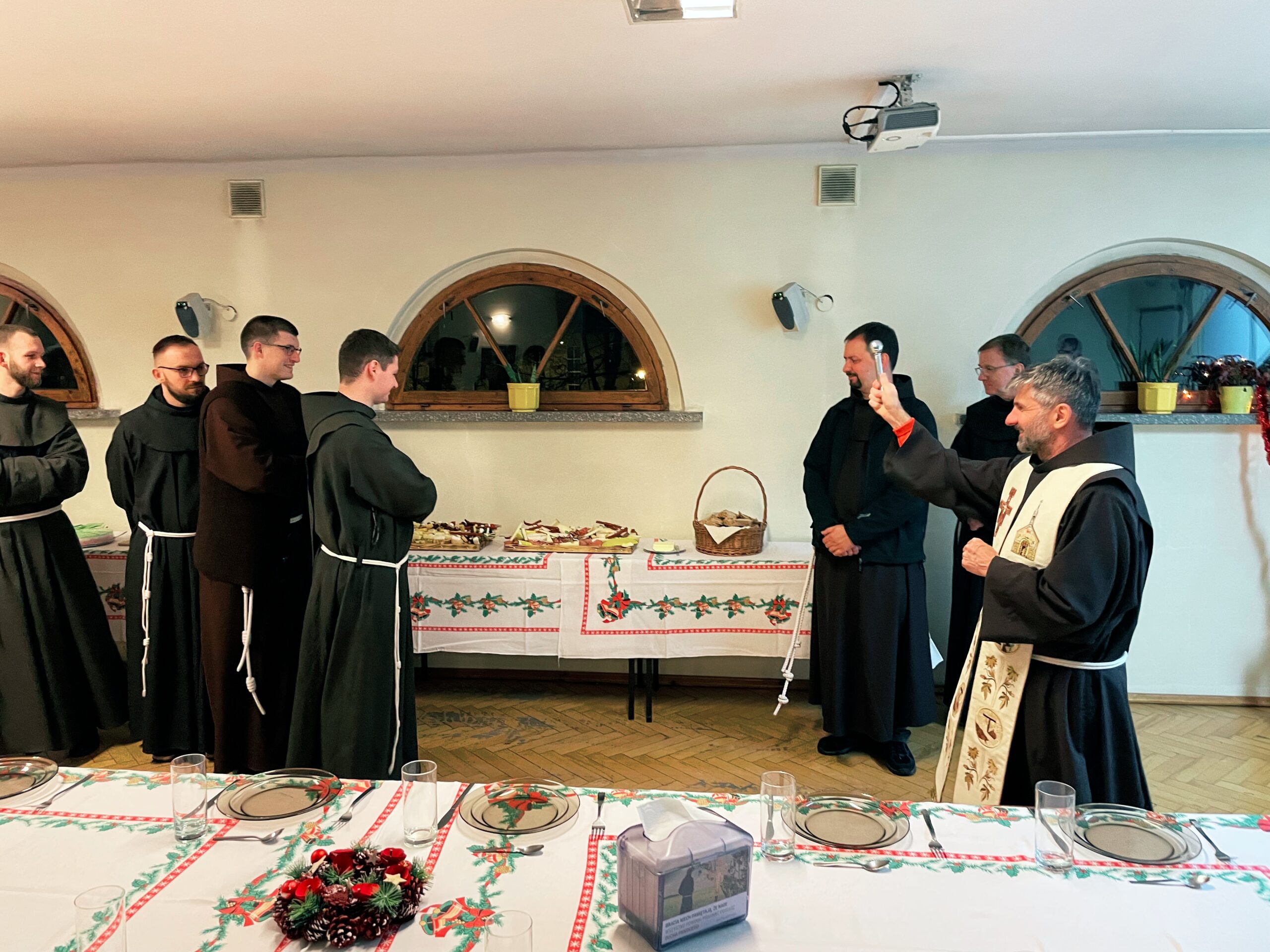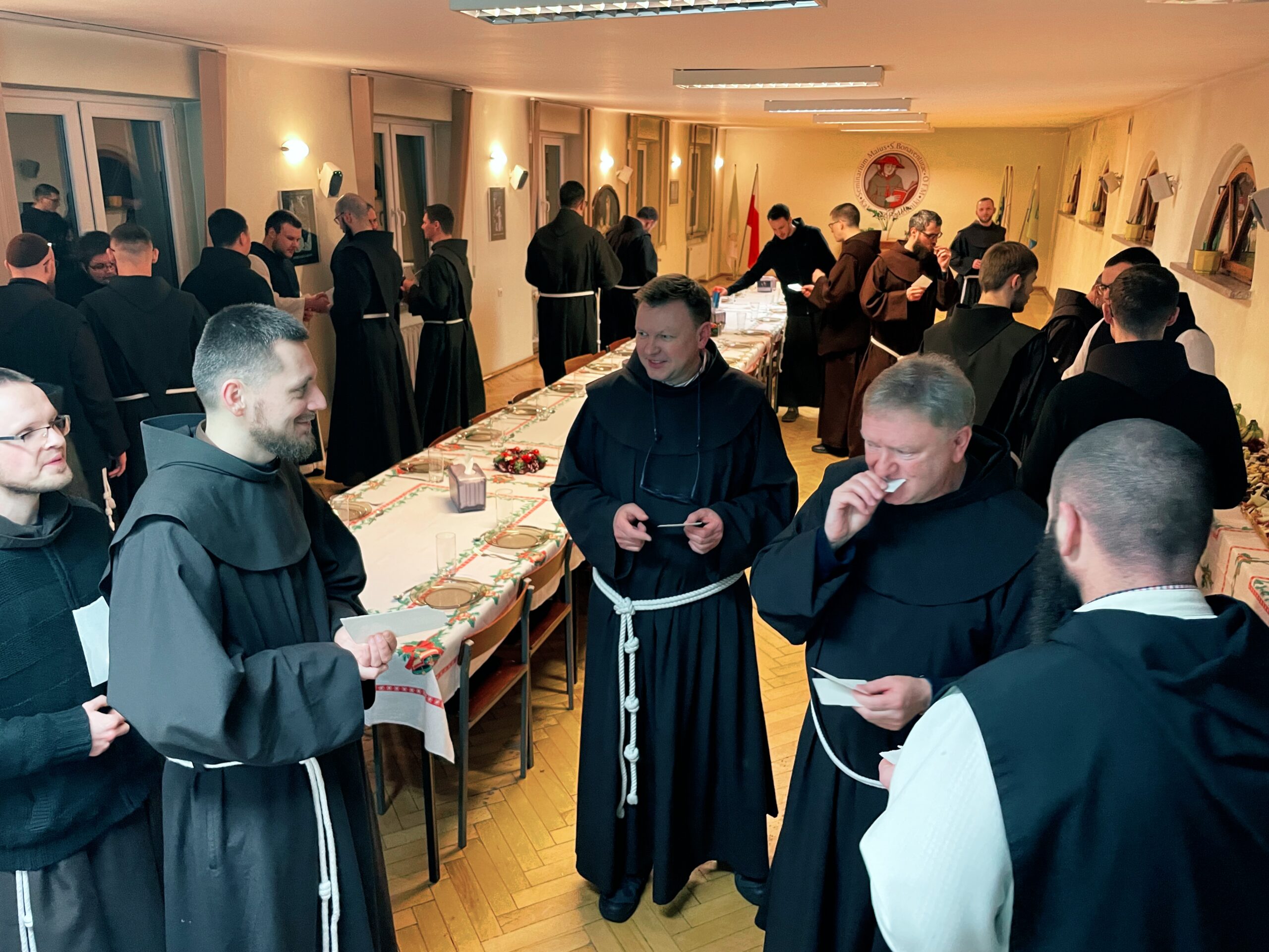 W wielu miejscach stało się zwyczajem, aby w kameralnym gronie przed samą Wigilią, spotkać się przed uroczystością Narodzenia Pańskiego. Taka tradycja istnieje również i w panewnickim seminarium, gdzie bracia przed świątecznymi wyjazdami, zebrali się w wieczór 22 grudnia, aby przy wspólnym stole cieszyć się ze zbliżającego czasu nadejścia i objawienia się Chrystusa przez łaskę, zgodnie z naszą tęsknotą i oczekiwaniem w czasie Adwentu. Jak każe obyczaj, krótkie sermo do zgromadzonych wygłosił ojciec rektor o. August Smyczek OFM, który pochylając się nad tajemnicą Nawiedzenia, ujął je jako prowadzące do misterium bożonarodzeniowego. Oprócz alumnów na spotkaniu opłatkowym był obecny minister prowincjonalny o. Witosław Sztyk OFM, o. proboszcz Samuel Kukiełka OFM, o. gwardian Sergiusz Bałdyga OFM, ojciec duchowny Ezdrasz Biesok OFM i ojcowie magistrzy – Olgierd Paszkiewicz OFM i Euzebiusz Skorupa OFM. Zebrani w radosnej atmosferze przełamali się opłatkiem, złożyli sobie życzenia i zasiedli do wspólnego, wigilijnego stołu.