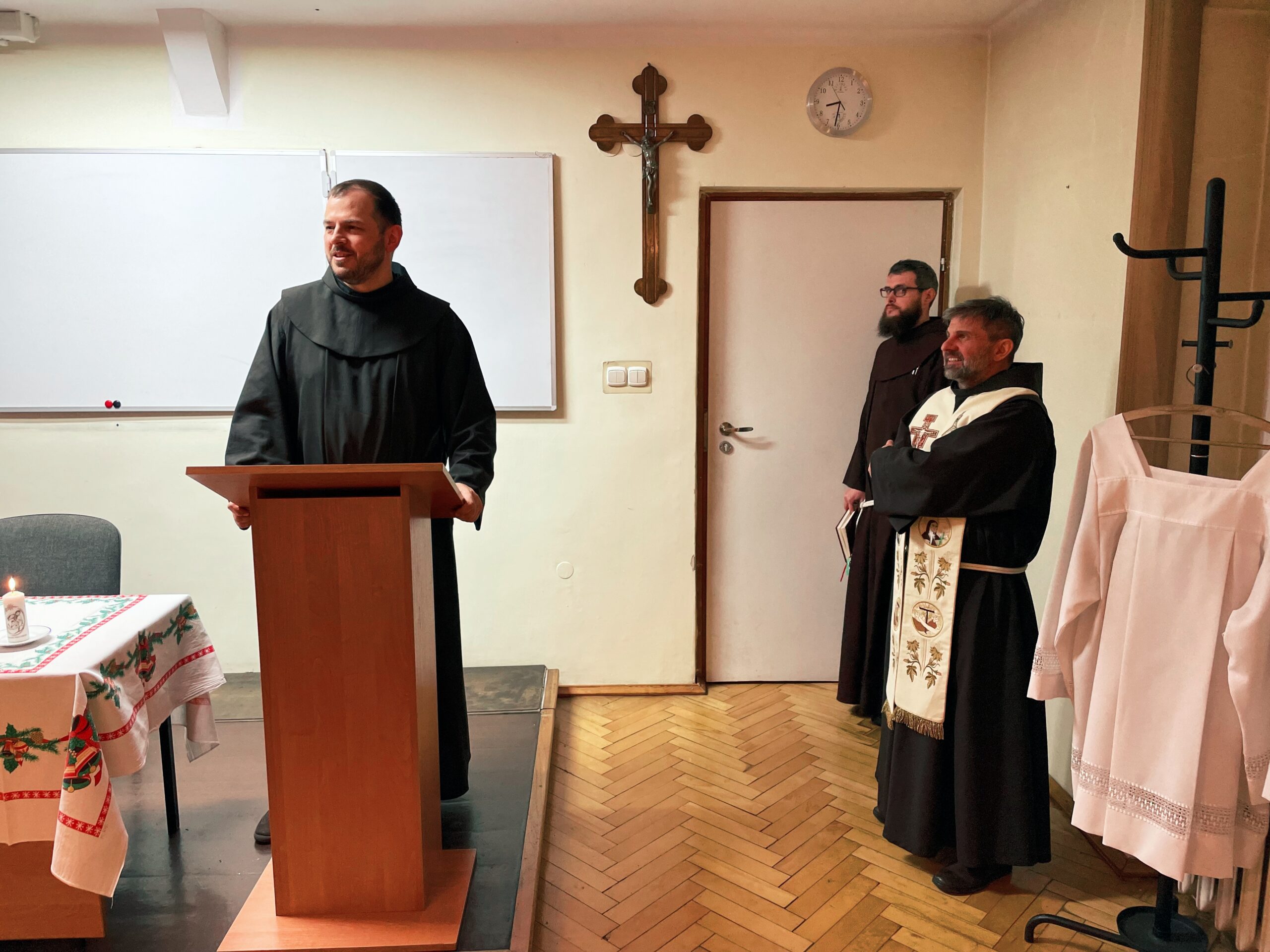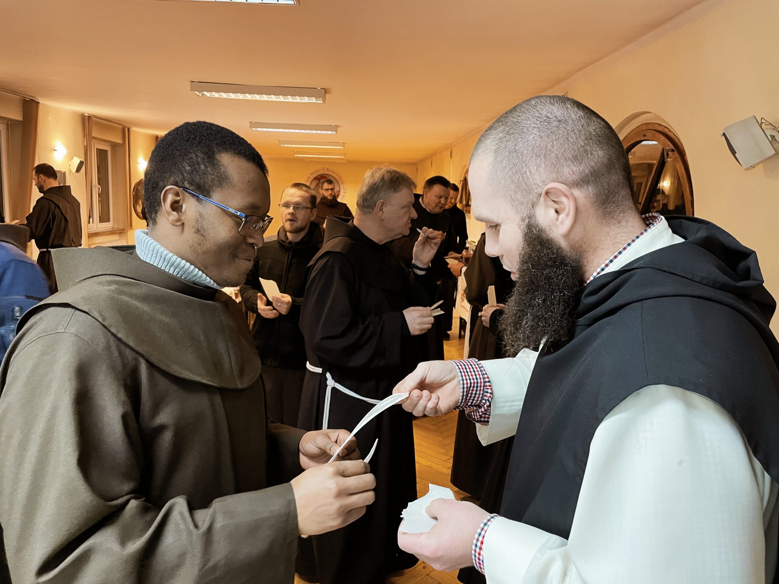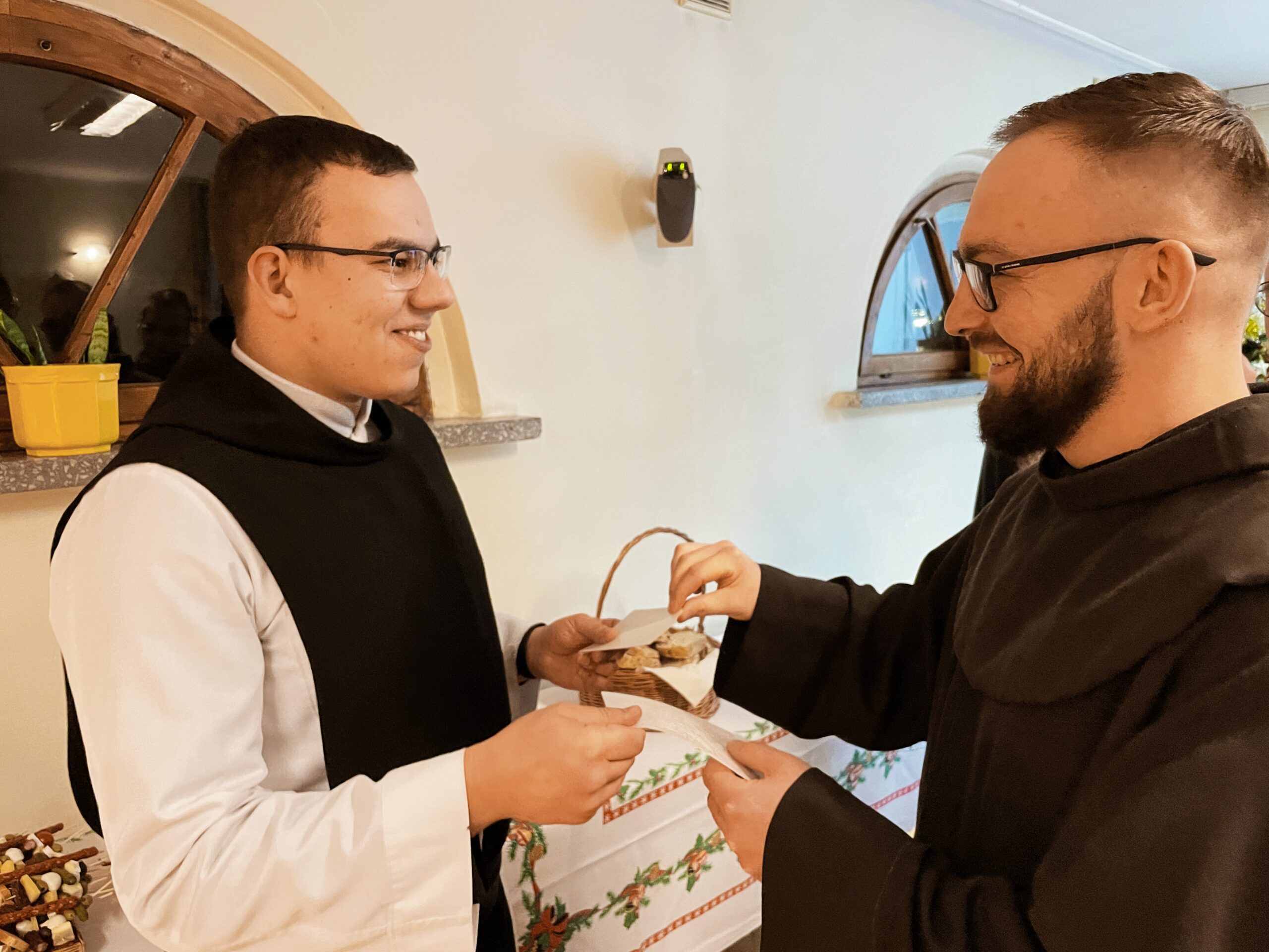 W wielu miejscach stało się zwyczajem, aby w kameralnym gronie przed samą Wigilią, spotkać się przed uroczystością Narodzenia Pańskiego. Taka tradycja istnieje również i w panewnickim seminarium, gdzie bracia przed świątecznymi wyjazdami, zebrali się w wieczór 22 grudnia, aby przy wspólnym stole cieszyć się ze zbliżającego czasu nadejścia i objawienia się Chrystusa przez łaskę, zgodnie z naszą tęsknotą i oczekiwaniem w czasie Adwentu. Jak każe obyczaj, krótkie sermo do zgromadzonych wygłosił ojciec rektor o. August Smyczek OFM, który pochylając się nad tajemnicą Nawiedzenia, ujął je jako prowadzące do misterium bożonarodzeniowego. Oprócz alumnów na spotkaniu opłatkowym był obecny minister prowincjonalny o. Witosław Sztyk OFM, o. proboszcz Samuel Kukiełka OFM, o. gwardian Sergiusz Bałdyga OFM, ojciec duchowny Ezdrasz Biesok OFM i ojcowie magistrzy – Olgierd Paszkiewicz OFM i Euzebiusz Skorupa OFM. Zebrani w radosnej atmosferze przełamali się opłatkiem, złożyli sobie życzenia i zasiedli do wspólnego, wigilijnego stołu.