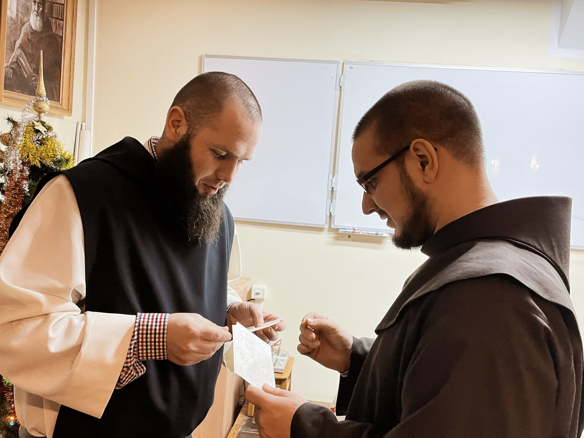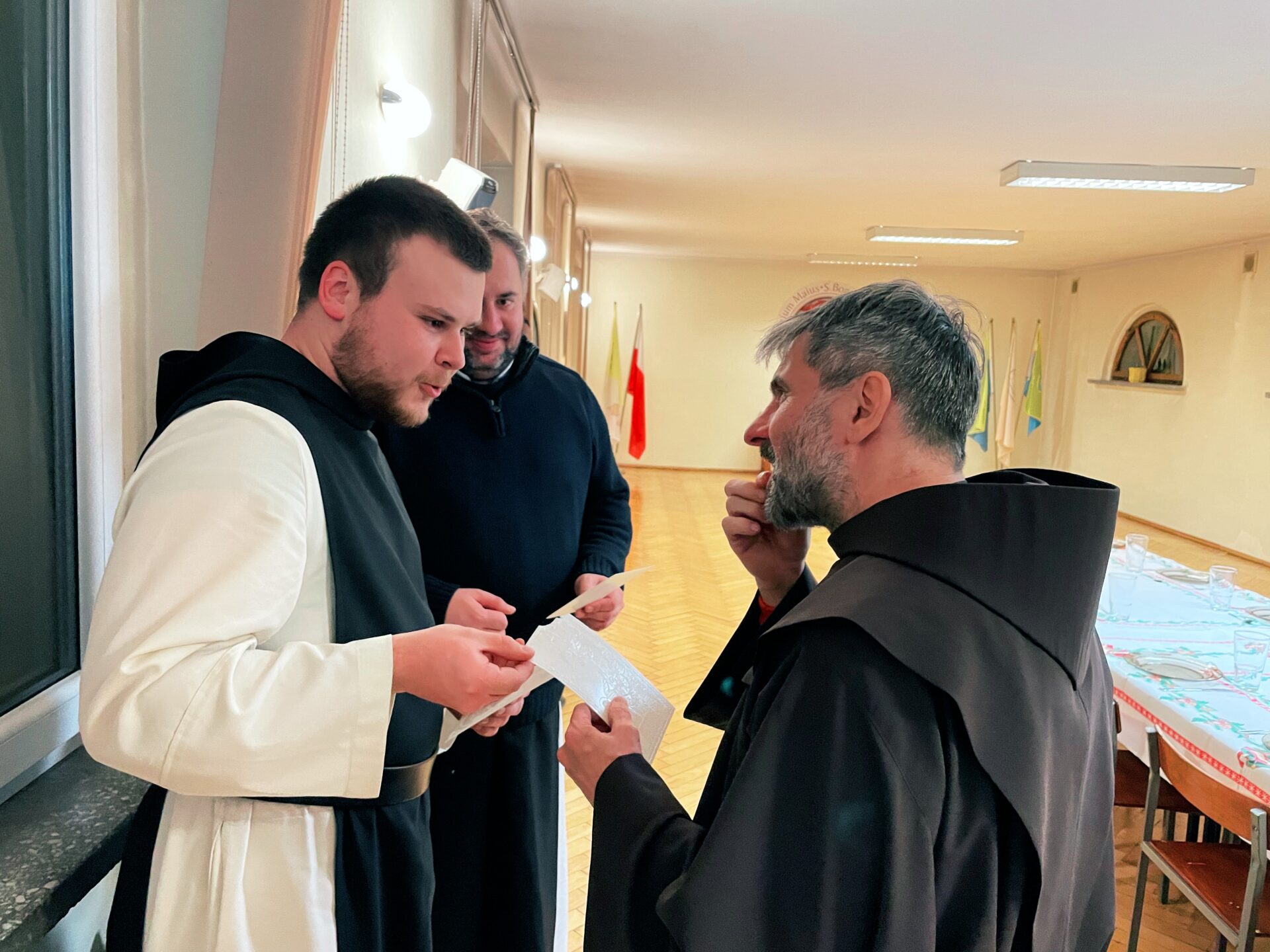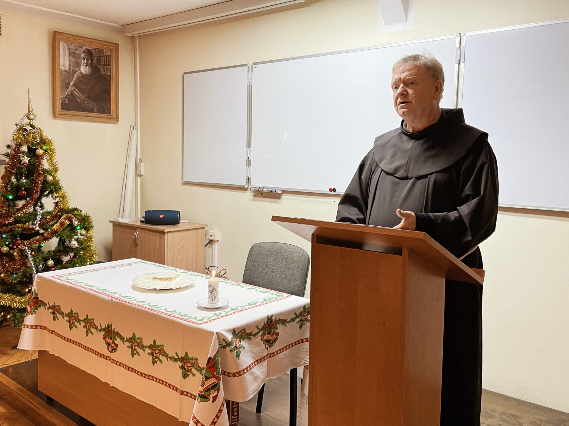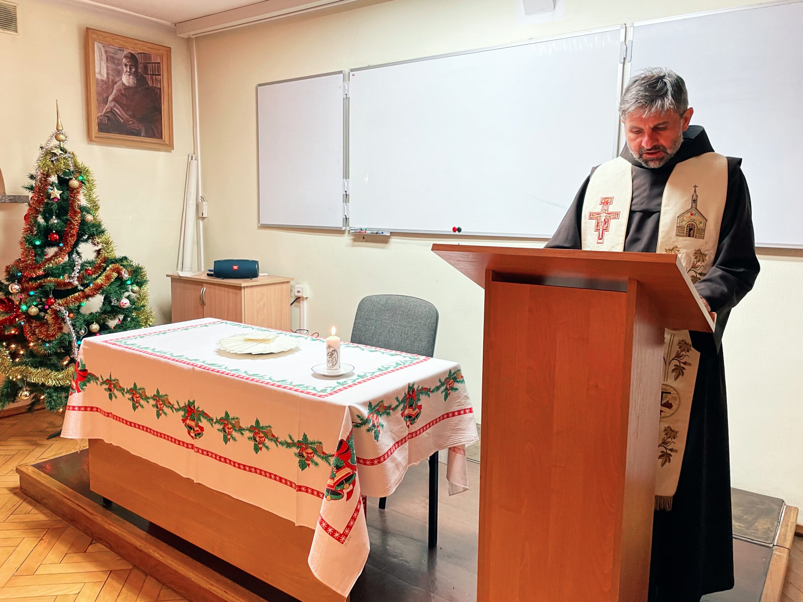 W wielu miejscach stało się zwyczajem, aby w kameralnym gronie przed samą Wigilią, spotkać się przed uroczystością Narodzenia Pańskiego. Taka tradycja istnieje również i w panewnickim seminarium, gdzie bracia przed świątecznymi wyjazdami, zebrali się w wieczór 22 grudnia, aby przy wspólnym stole cieszyć się ze zbliżającego czasu nadejścia i objawienia się Chrystusa przez łaskę, zgodnie z naszą tęsknotą i oczekiwaniem w czasie Adwentu. Jak każe obyczaj, krótkie sermo do zgromadzonych wygłosił ojciec rektor o. August Smyczek OFM, który pochylając się nad tajemnicą Nawiedzenia, ujął je jako prowadzące do misterium bożonarodzeniowego. Oprócz alumnów na spotkaniu opłatkowym był obecny minister prowincjonalny o. Witosław Sztyk OFM, o. proboszcz Samuel Kukiełka OFM, o. gwardian Sergiusz Bałdyga OFM, ojciec duchowny Ezdrasz Biesok OFM i ojcowie magistrzy – Olgierd Paszkiewicz OFM i Euzebiusz Skorupa OFM. Zebrani w radosnej atmosferze przełamali się opłatkiem, złożyli sobie życzenia i zasiedli do wspólnego, wigilijnego stołu.