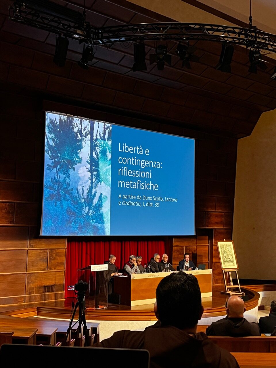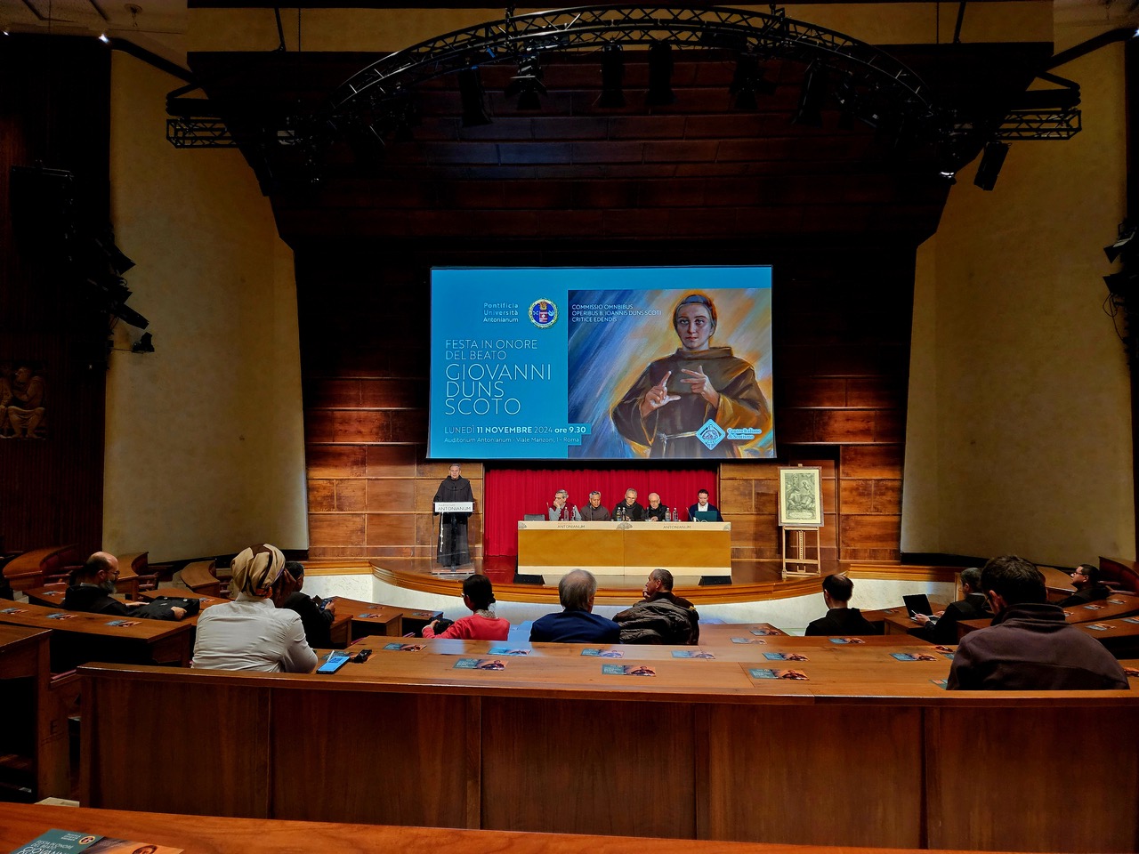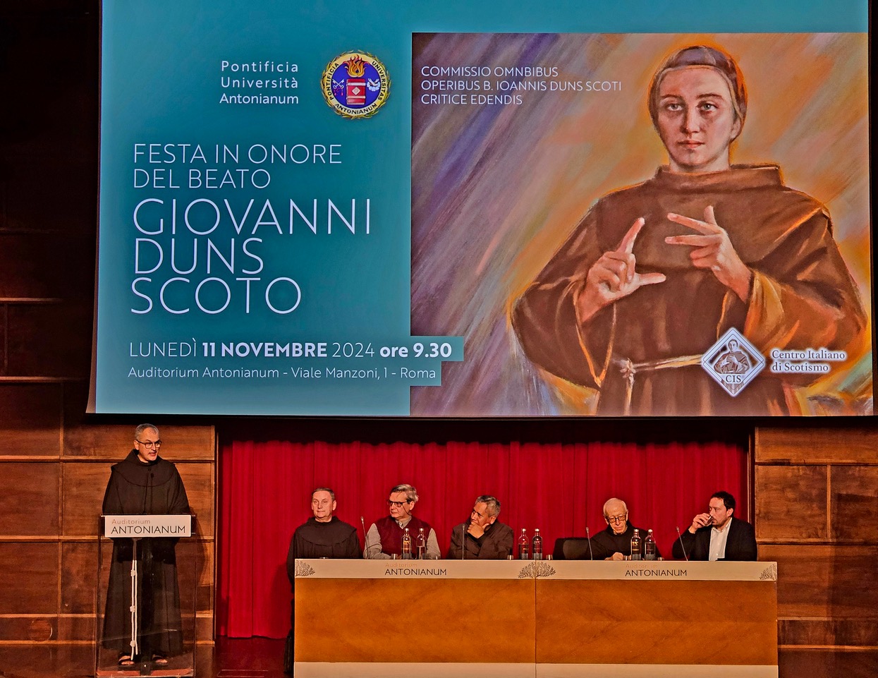 11 listopada 2024 r. odbyło się w Aula Magna na Antonianum w Rzymie doroczne sympozjum poświęcone myśli bł. Jana ze Szkocji. Spotkanie moderował o. Witold Salamon OFM z Komsji Szkotystycznej. Głównym prelegentem był dr Andrea Nannini, który przedstawił oryginalne rozwiązanie Szkota dotyczące problematyki przygodności i wolności. Przygodność według Szkota to możliwość zrealizowania się czegoś przeciwnego w momencie, gdy realizowany jest dany fakt przygodny (“contingens [est] … cuius oppositum posset fieri quando illud fit” – Ord. I d. 2 n. 86). Dr Nannini przedstawił najpierw koncepcję Arystotelesa, wg którego przygodne jest to, co jest możliwe i faktycznie zostało już zrealizowane albo zostanie zrealizowane. Jest to tzw. przygodność diachroniczna. Potem na podstawie analizy tekstów z Ordinatio i Lectura I d. 39 przedstawił rozwiązanie Szkota, które nazywane jest przygodnością synchroniczną. Właśnie taka przygodność cechuje naszą wolę, która w tym samym momencie może chcieć czegoś, nie chcieć tego albo wstrzymać się od aktu chcenia (Szkot nazywa to: velle, nolle i non-velle). Ten trzeci przypadek dotyczy np. sytuacji, w której człowiek decyduje się na grzech, a Pan Bóg “wstrzymuje się od chcenia” (akt non-velle) i pozostawia człowiekowi wolność do dobra i do zła.